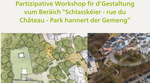 Wéi soll de Beräich „Schlasskéier – Rue du Château – Park hannert dem Gemengenhaus“ an Zukunft ausgesin ? Bréngt Är Iddie mat an ee partizipative Workshop a gestalt zesumme mat eis een ëffentleche Raum, deen agreabel, funktionell an op d’Besoine vun der Uewerstad ofgestëmmt ass.