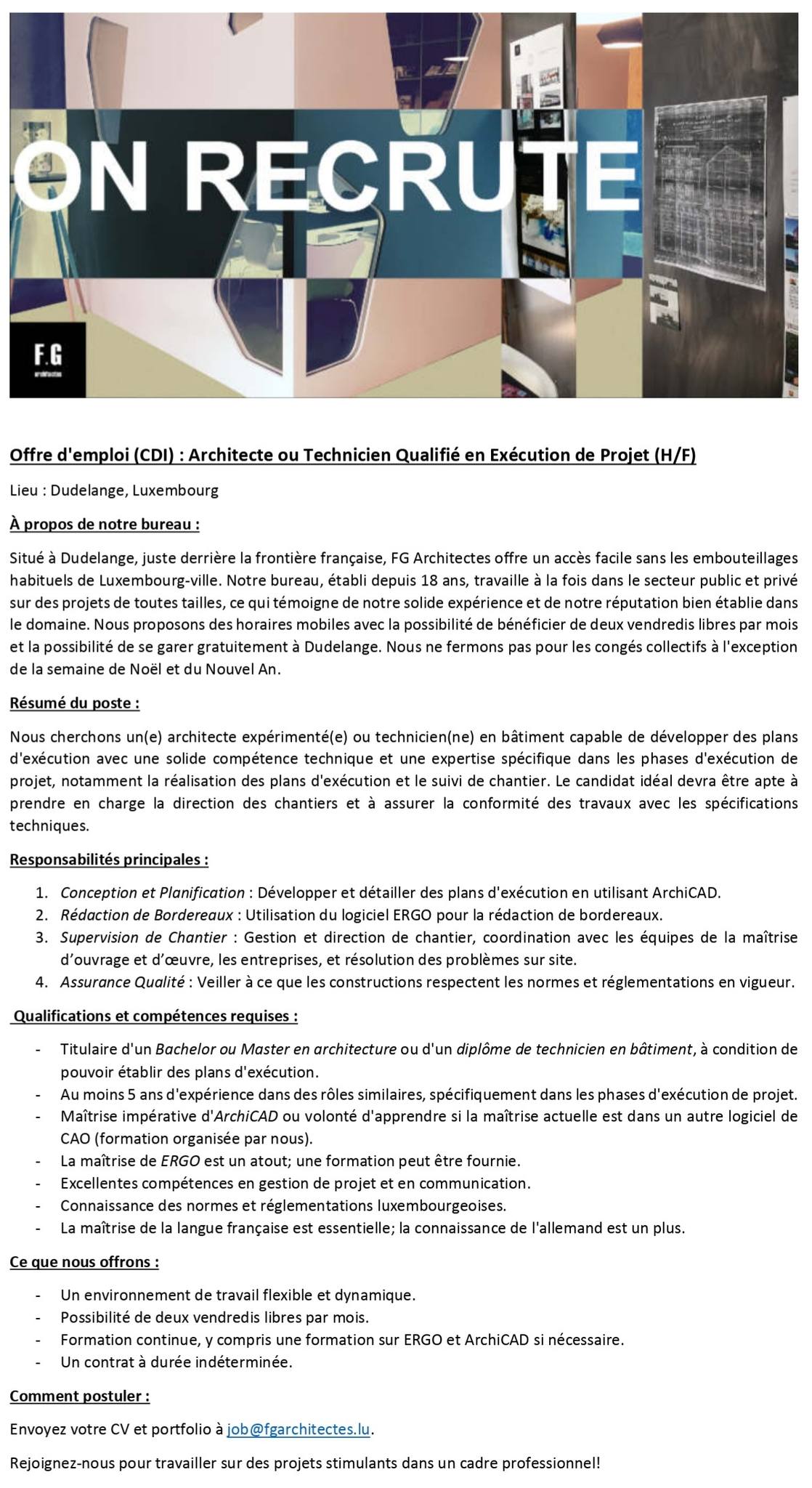 1 architecte chef de projet expérimenté (m/f)/ FG architectes Voir toutes les offres FG architectes recrute ! Lien pour postuler : cliquez ici