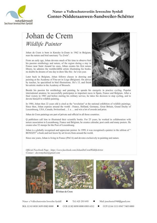 Johan de Crem will also exhibit his works in the headquarters of natur&ëmwelt in Kockelscheuer between 16.11-15.12.2019 (open every day from 14-17:30) !