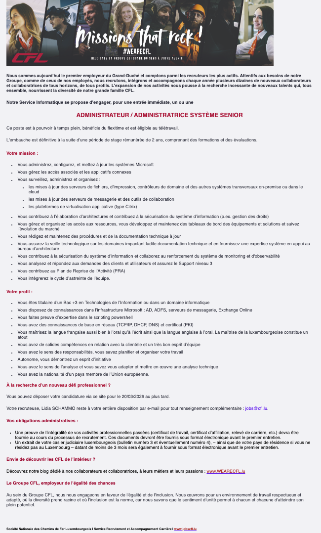 Administrateur (M/F) système senior Voir toutes les offres CFL recrute ! Lien pour postuler : cliquez ici