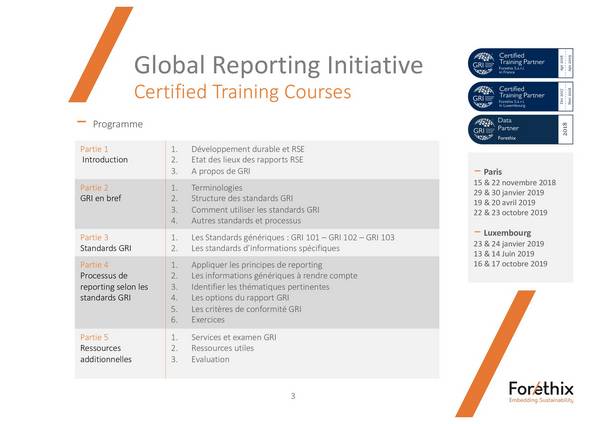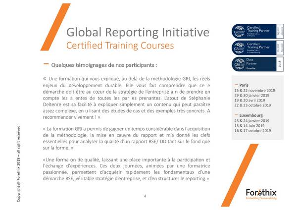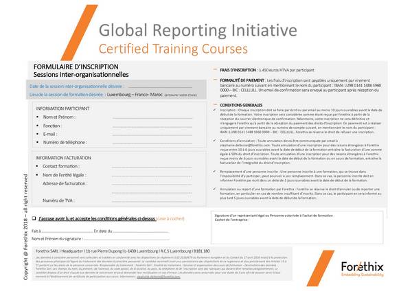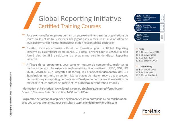 Forethix, Cabinet-partenaire officiel de formation pour le Global Reporting Initiative au Luxembourg, a le plaisir de vous communiquer ses prochaines sessions de formation pour 2019, en collaboration avec l’Institut National de Développement Durable et de Responsabilité Sociétale à Luxembourg (INDR) : 23 & 24 janvier 2019, 13 & 14 juin 2019 et 16 & 17 octobre 2019.