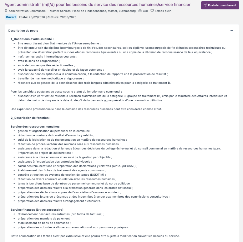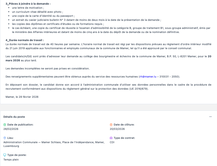 Agent administratif (M/F) Service des ressources humaines/financier Voir toutes les offres La Commune de Mamer recrute ! Lien pour postuler : cliquez ici