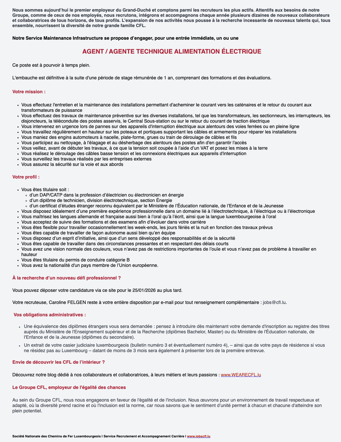 Agent (m/f) technique alimentation électrique / CFL Voir toutes les offres CFL recrute ! Lien pour postuler : cliquez ici