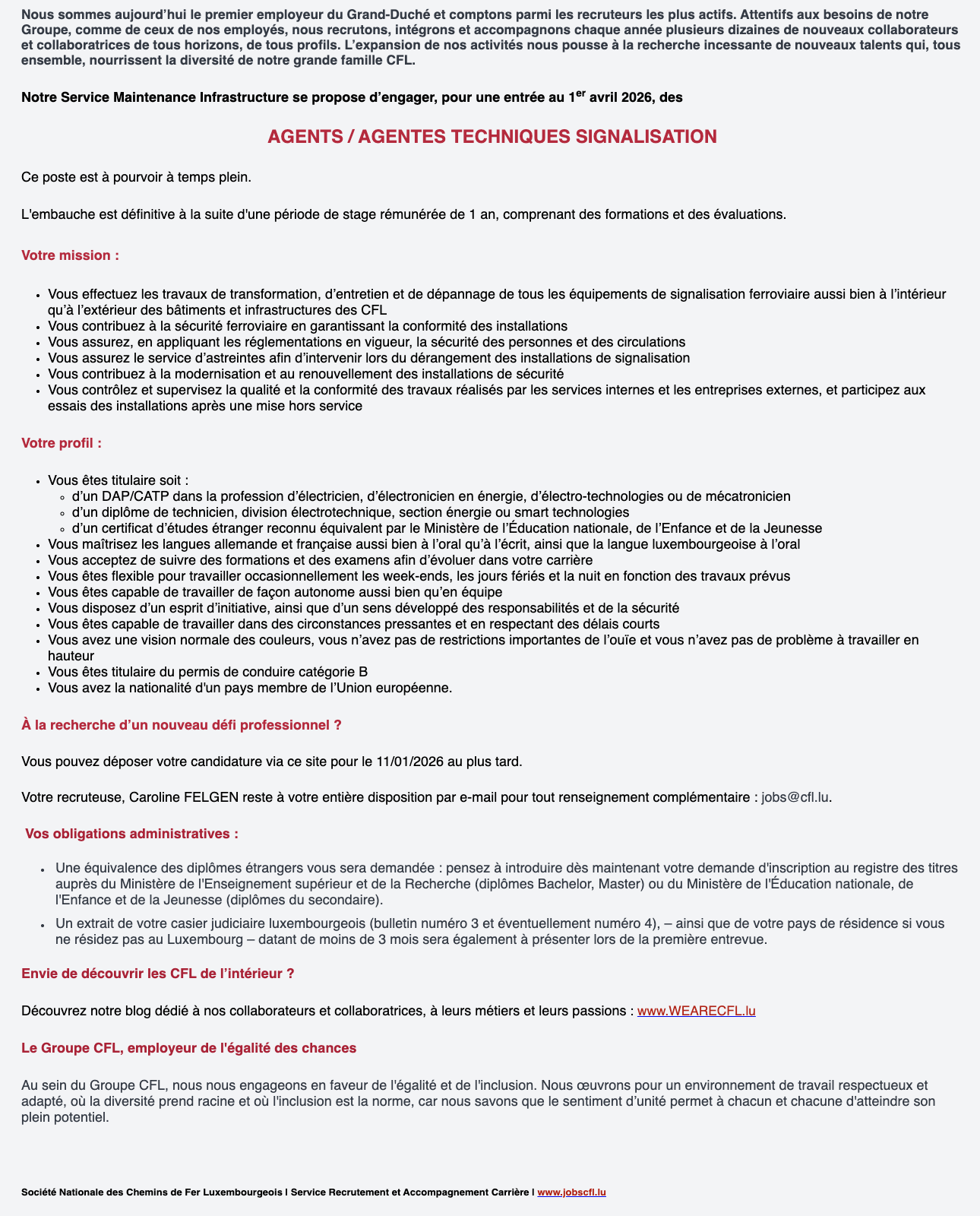 Agents (m/f) techniques signalisation / CFL Voir toutes les offres CFL recrute ! Lien pour postuler : cliquez ici