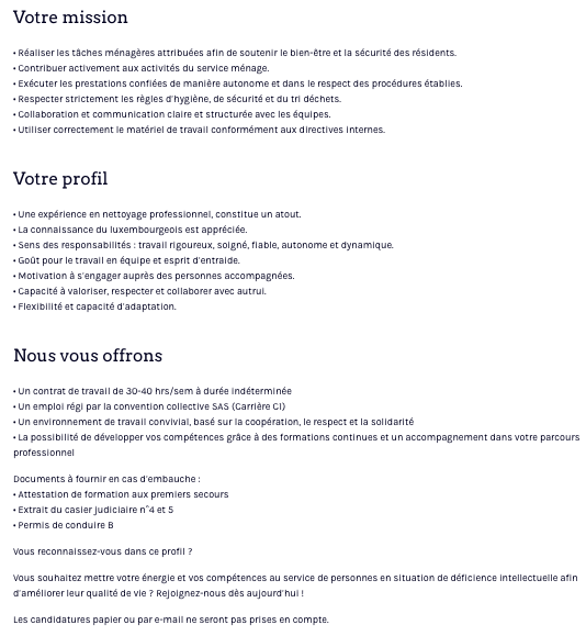 Aides-ménagères (M/F) Voir toutes les offres Elisabeth Luxembourg recrute ! Lien pour postuler : cliquez ici