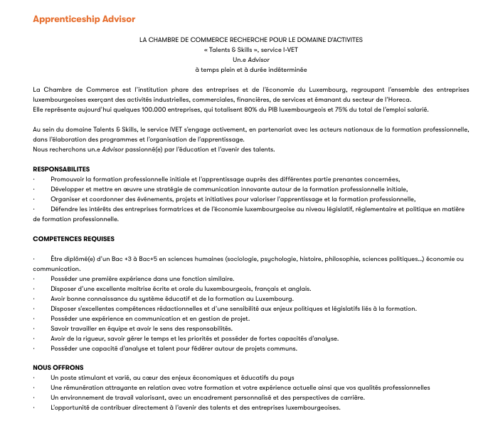 Apprenticeship Advisor (M/F) Voir toutes les offres La Chambre de Commerce du Luxembourg recrute ! Lien pour postuler : cliquez ici