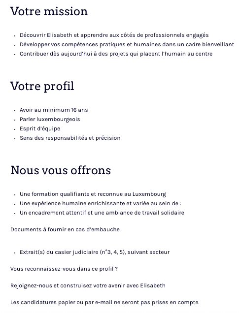 Apprentis (M/F) Voir toutes les offres Elisabeth Luxembourg recrute ! Lien pour postuler : cliquez ici