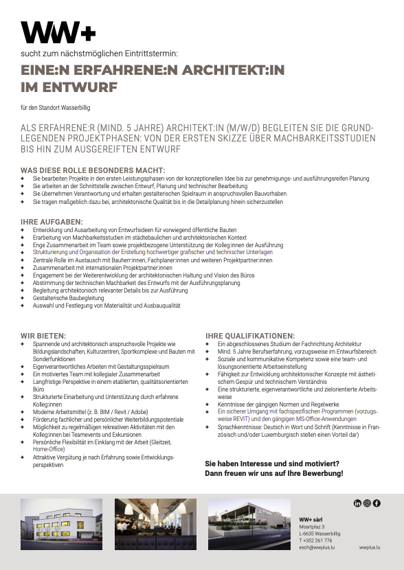 Architekt : in im entwurf (M/F) Voir toutes les offres WW+ sucht zum nächstmöglichen Eintrittstermin : Lien pour postuler : cliquez ici
