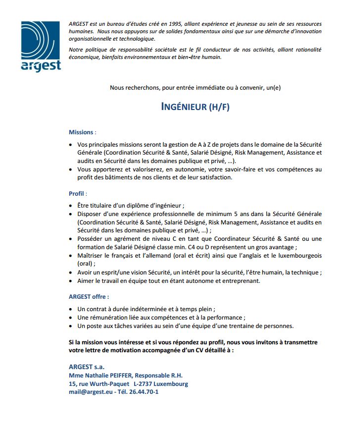 ARGEST S.A. recrute ! Voir toutes les offres Ingénieur (h/f) Pour plus d’informations : www.argest.eu