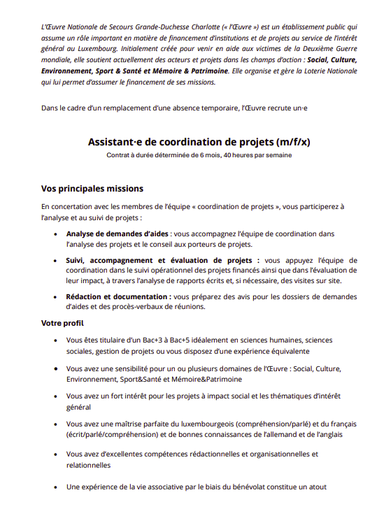 Assistant de coordination de projets (m/f/x) / Œuvre Nationale