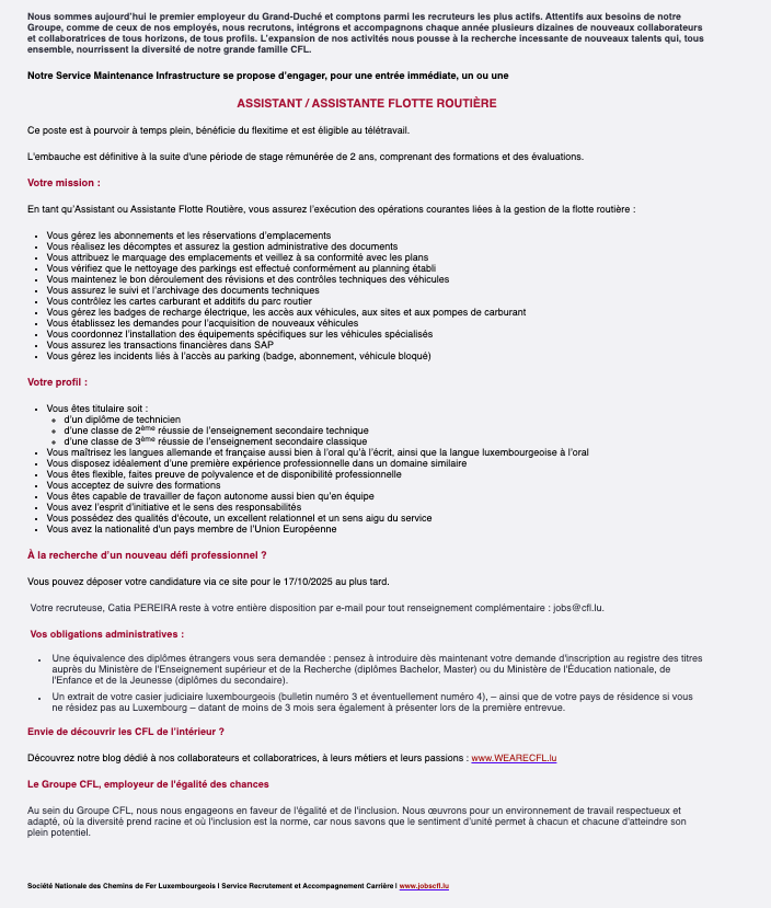 Assistant flotte routière (m/f) / CFL Voir toutes les offres CFL recrute ! Lien pour postuler : cliquez ici