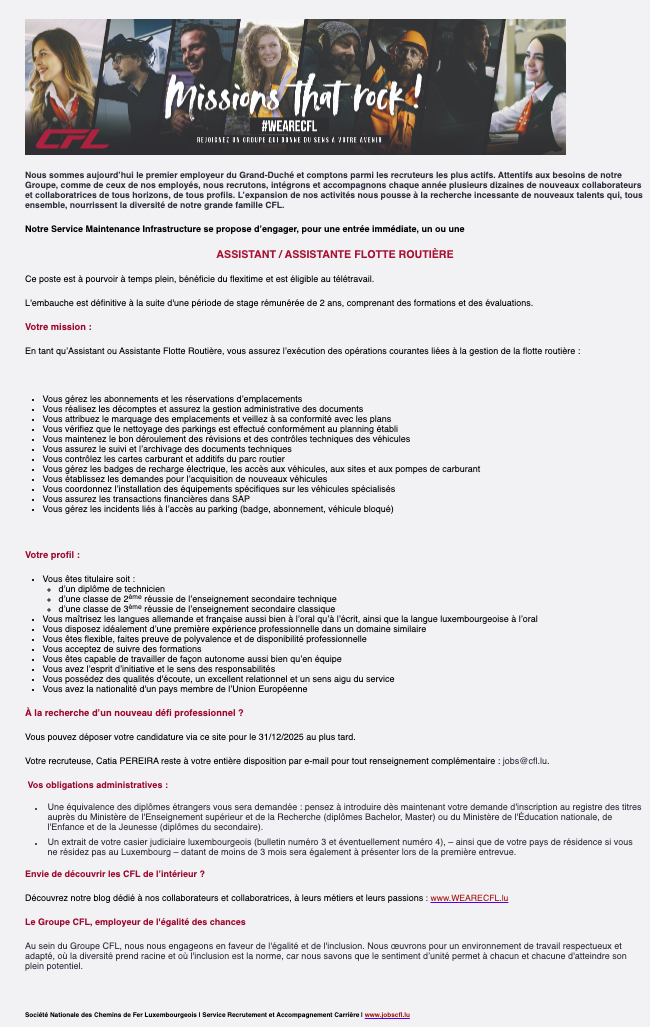 Assistant (m/f ) flotte routière / CFL Voir toutes les offres CFL recrute ! Lien pour postuler : cliquez ici