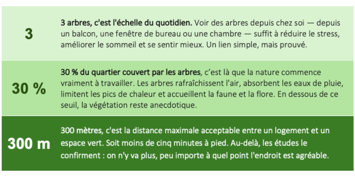 3 arbres visibles depuis sa fenêtre. 30 % de canopée dans son quartier. 300 mètres jusqu’au parc le plus proche. Et si on pouvait mesurer la qualité de vie en ville avec trois chiffres seulement ?