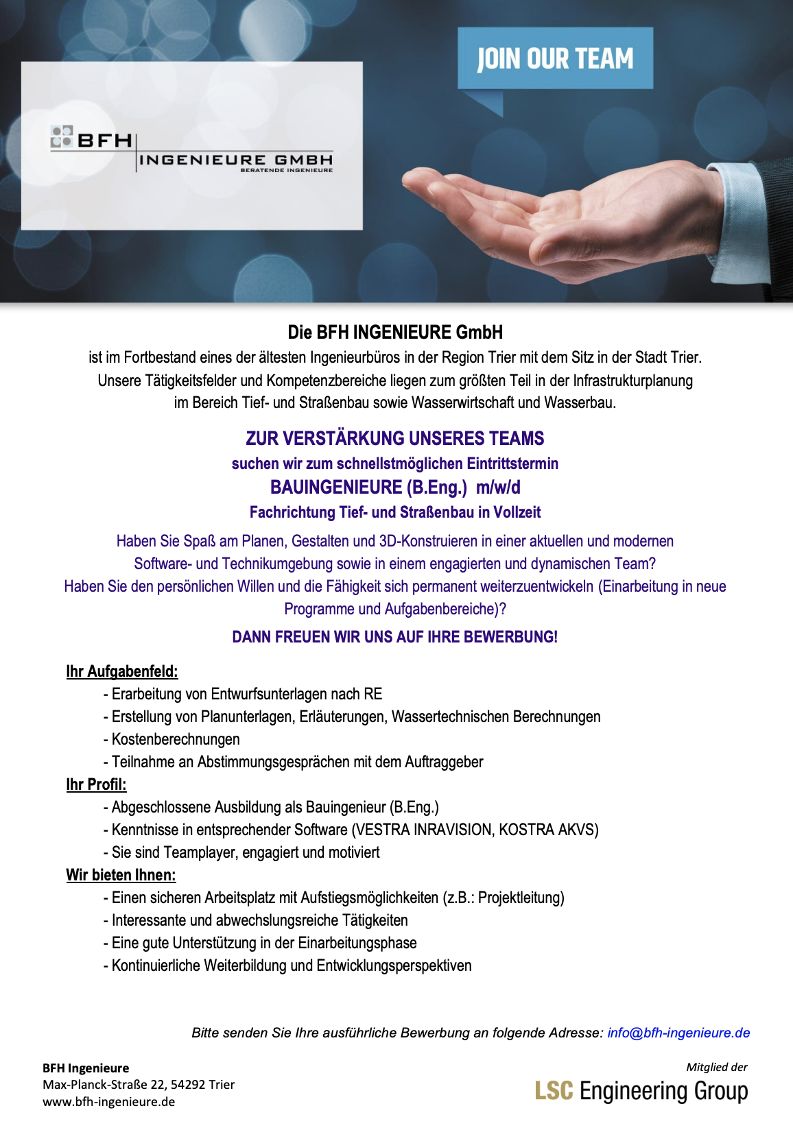 Senden Sie Ihre Bewerbung direkt an : info@bfh-ingenieure.de