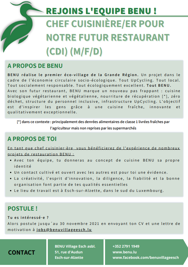 BENU Village Esch asbl recrute ! Voir toutes les offres Chef cuisinier pour notre futur restaurant (CDI) (m/f/d) Pour plus d’informations : http://benu.lu/