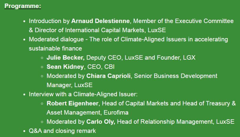 The Luxembourg Stock Exchange (LuxSE) and Climate Bonds Initiative (CBI) have joined forces on a new initiative and have the pleasure to invite you to an exciting virtual launch event on Thursday 25 February, 2021 at 10:30 CET (9:30 GMT). During the 45-minute webinar, we will unveil a brand new dimension of the Luxembourg Green Exchange (LGX) made possible through a partnership with CBI.