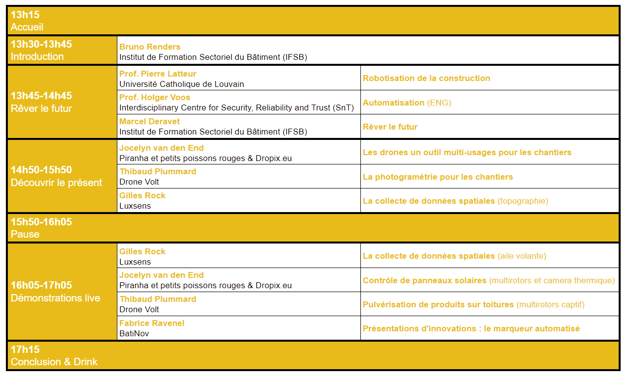 Cette conférence sera l’occasion de débattre des drones sur le chantier du futur, mais sera également une occasion unique de découvrir concrètement les solutions déjà existantes lors d’une session de démonstrations en plein-air.