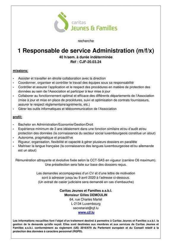 Responsable de service Administration (m/f/) 40 h/sem. à durée indéterminée