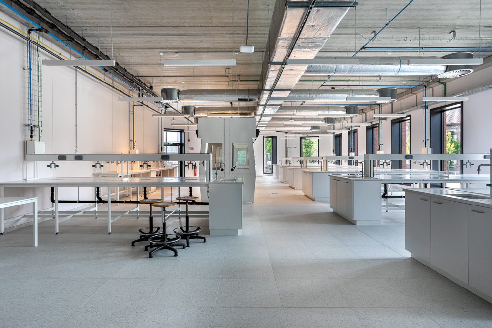 La périphérie du bâtiment accueille les laboratoires, les bureaux et les salles de cours, qui jouissent de la lumière naturelle et des vues sur l’extérieur. Le projet se dote de plusieurs cafétérias ; celle au second étage s’ouvre sur un vaste toit-terrasse comportant une végétation luxuriante composée d’une végétation haute, d’arbustes, d’un pré fleuri. Les auteurs de projet ont opté pour des finitions sobres et certains choix ont suivi la charte graphique de l’UMons dans un souci de cohérence et d’intégration dans le campus. Les plafonds sont recouverts d’un flocage en cellulose, les sols des espaces communs sont en granito et ceux des locaux plus restreints en linoléum de couleur rouge brique.