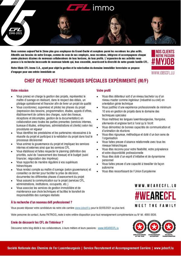 CFL recrute ! Voir toutes les offres Chef de projet techniques spéciales expérimenté (m/f) Pour plus d’informations : www.jobscfl.lu