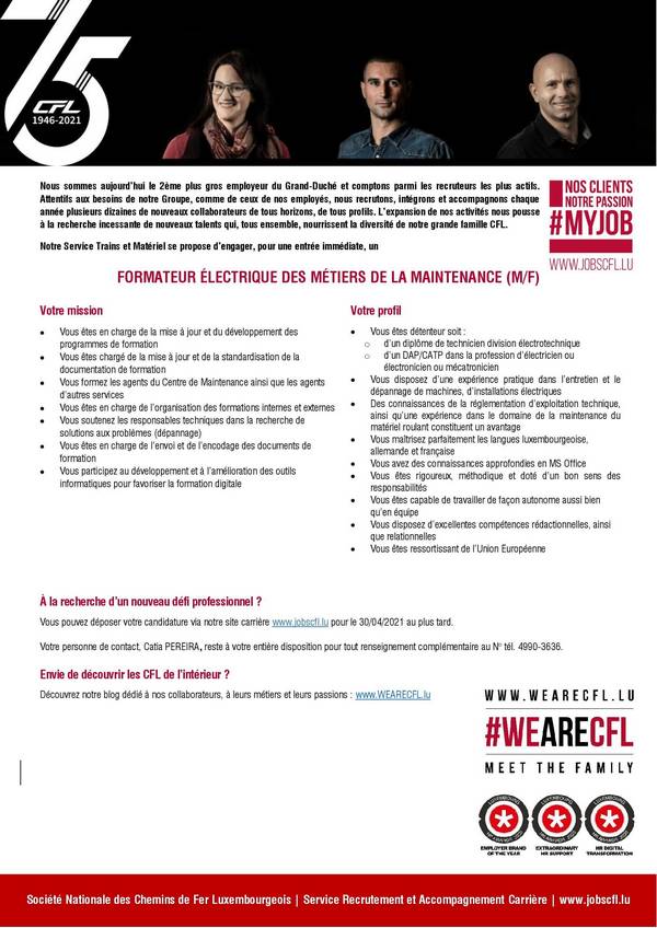 CFL recrute ! Voir toutes les offres Formateur Électrique des Métiers de la Maintenance (m/f) Plus d’informations : www.jobscfl.lu