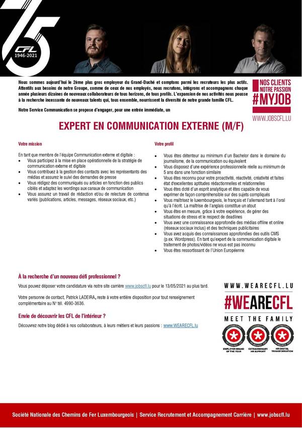 CFL recrute ! Voir toutes les offres Expert en communication externe (m/f) Pour plus d’informations : www.JOBSCFL.lu