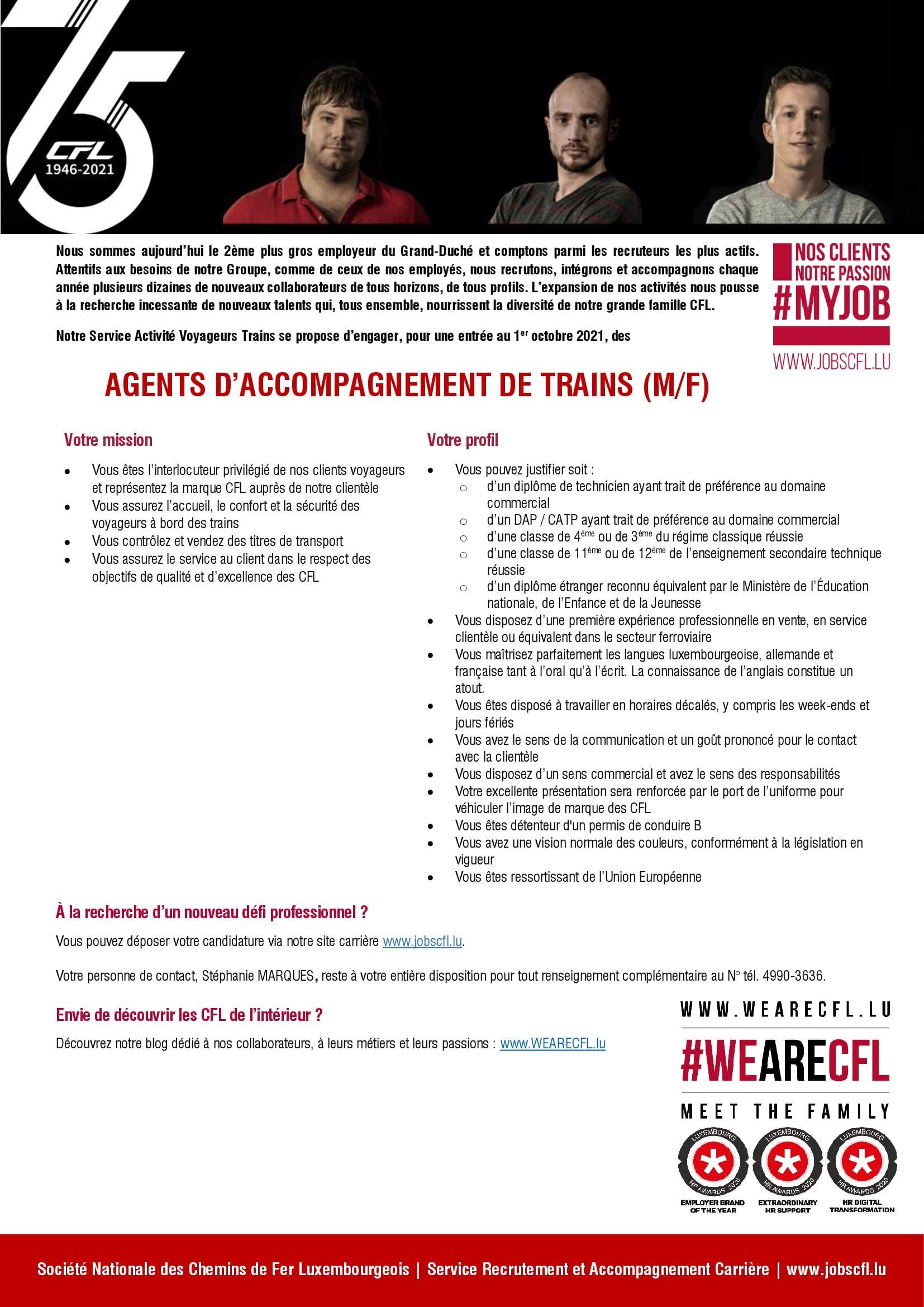CFL recrute ! Voir toutes les offres Agents d’accompagnement de trains (m/f) Pour plus d’informations : www.jobscfl.lu