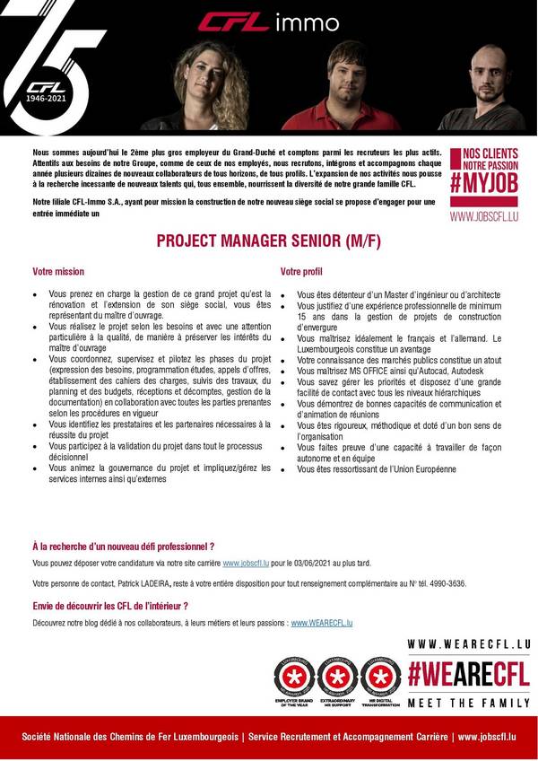 CFL recrute ! Voir toutes les offres Project manager senior (m/f) Pour plus d’informations : www.jobscfl.lu