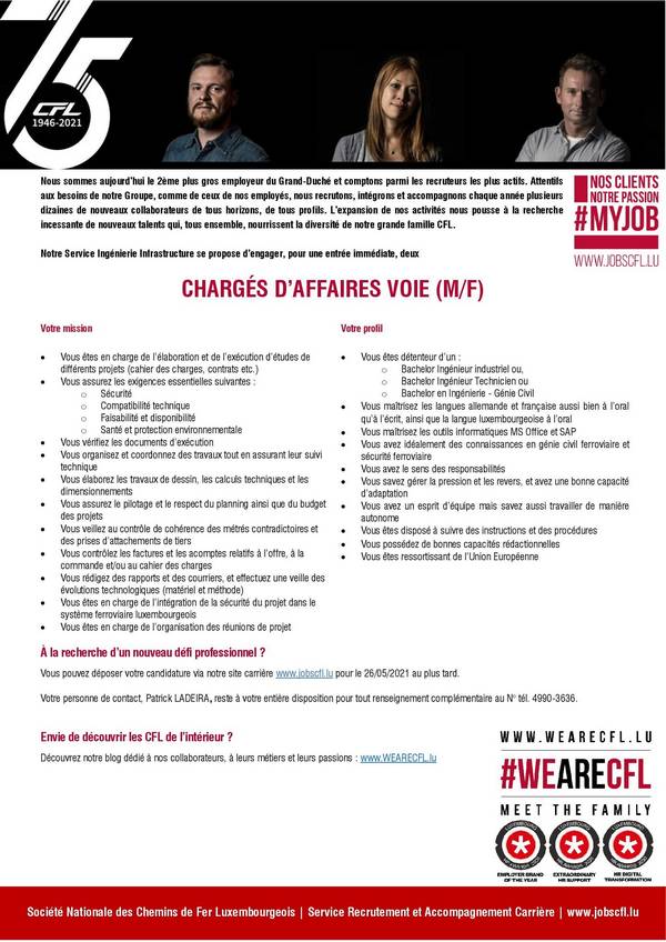 CFL recrute ! Voir toutes les offres Chargés d’affaires voie (m/f) Pour plus d’informations : www.jobscfl.lu