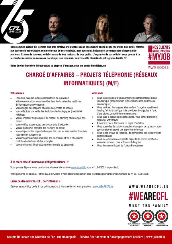 CFL recrute ! Voir toutes les offres Chargé d’affaires – Projets téléphonie (réseaux informatiques) (m/f) Pour plus d’informations : www.jobscfl.lu