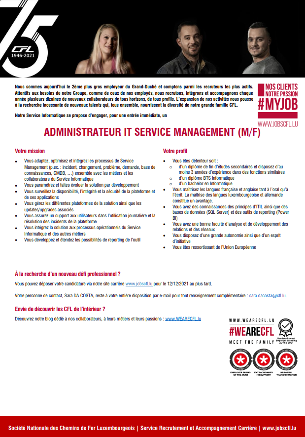 CFL recrute ! Voir toutes les offres Administrateur IT service management (m/f) Pour plus d’informations : www.jobscfl.lu