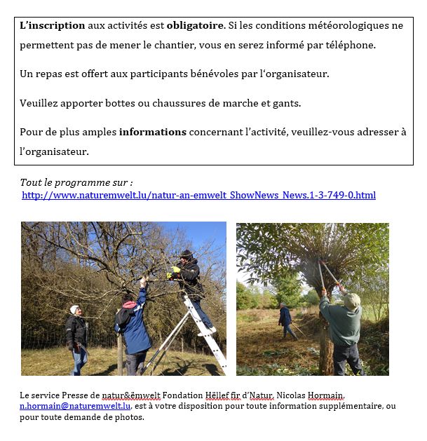 Information et inscription : natur&ëmwelt Leideleng-Recken (Marianne Thiry : 621 31 43 79 / m.thiry@naturemwelt.lu)