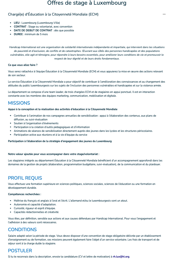 Chargé d’Éducation à la Citoyenneté Mondiale (ECM) (M/F) Voir toutes les offres Handicap International Luxembourg recrute ! Lien pour postuler : cliquez ici