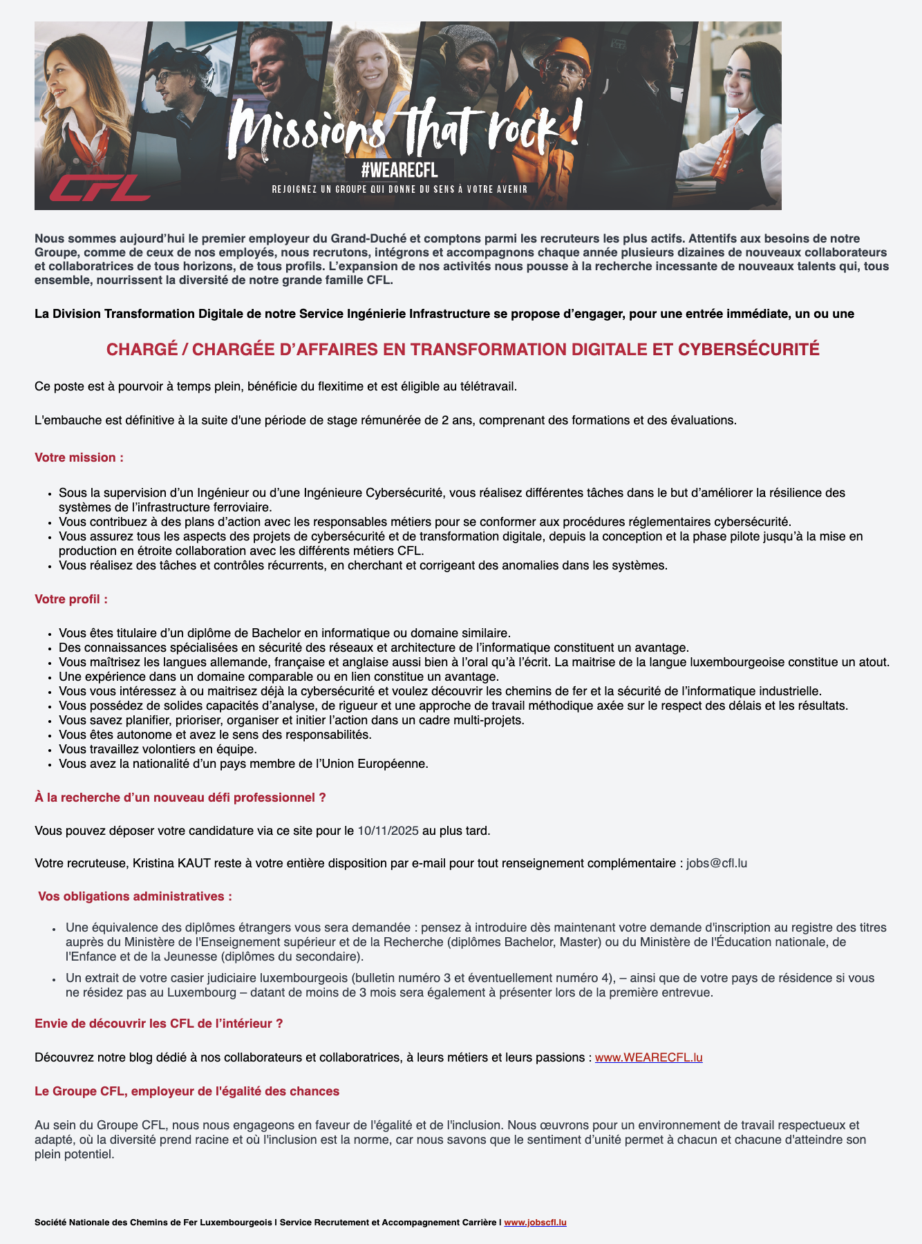 Chargé (m/f) d’affaires en transformation digitale et cybersécurité / CFL Voir toutes les offres CFL recrute ! Lien pour postuler : cliquez ici