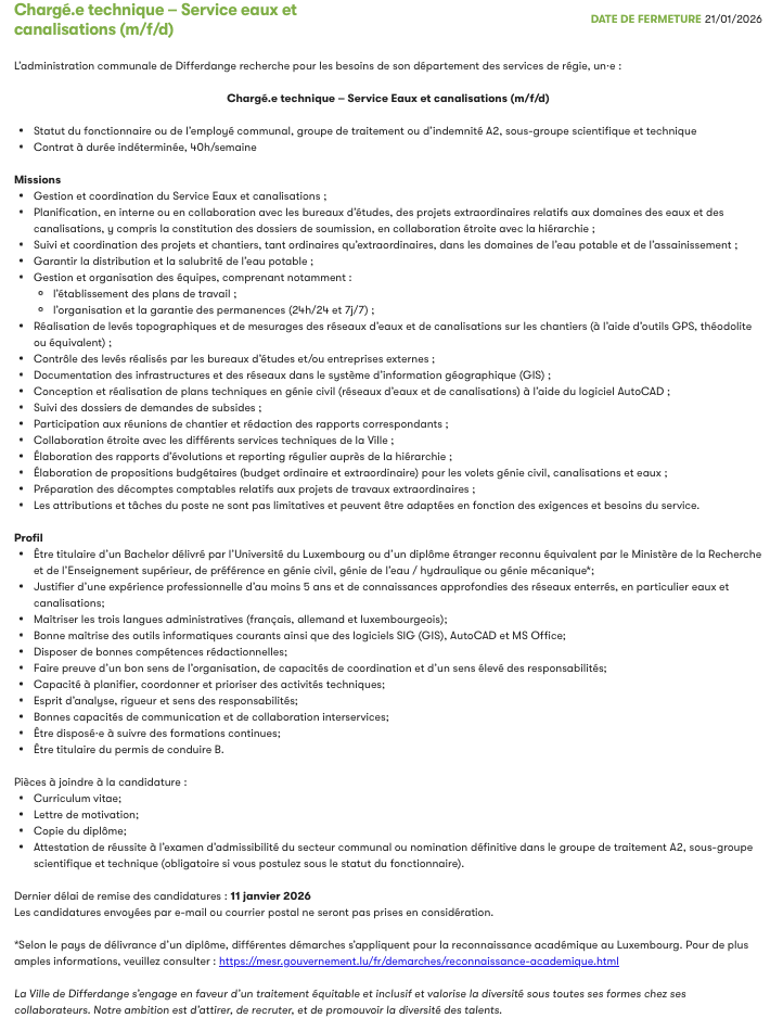 Chargé technique – Service Eaux et canalisations (M/F) Voir toutes les offres La ville de Differdange recrute ! Lien pour postuler : cliquez ici