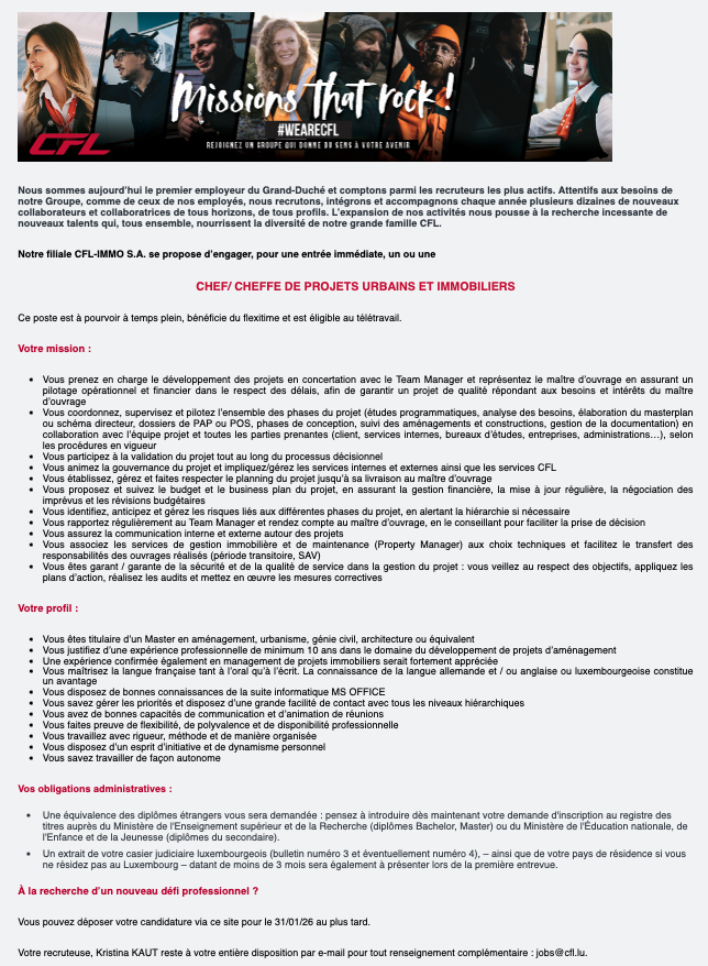 Chef-fe de projets urbains et immobiliers (M/F) Voir toutes les offres CFL recrute ! Lien pour postuler : cliquez ici