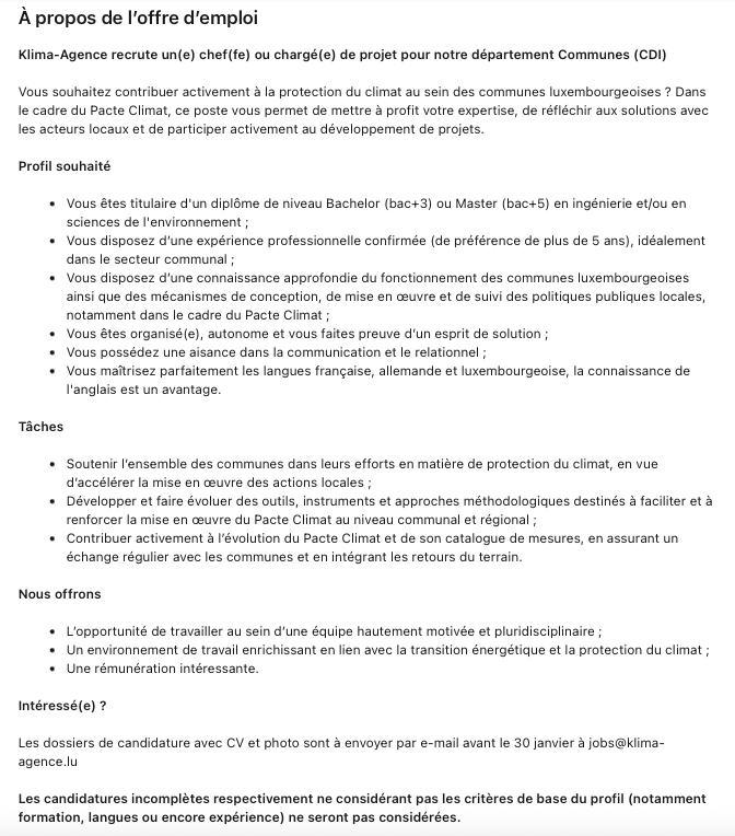 Chef(fe) ou Chargé(e) de projet - Département Communes (M/F) Voir toutes les offres Klima-Agence recrute ! Lien pour postuler : cliquez ici