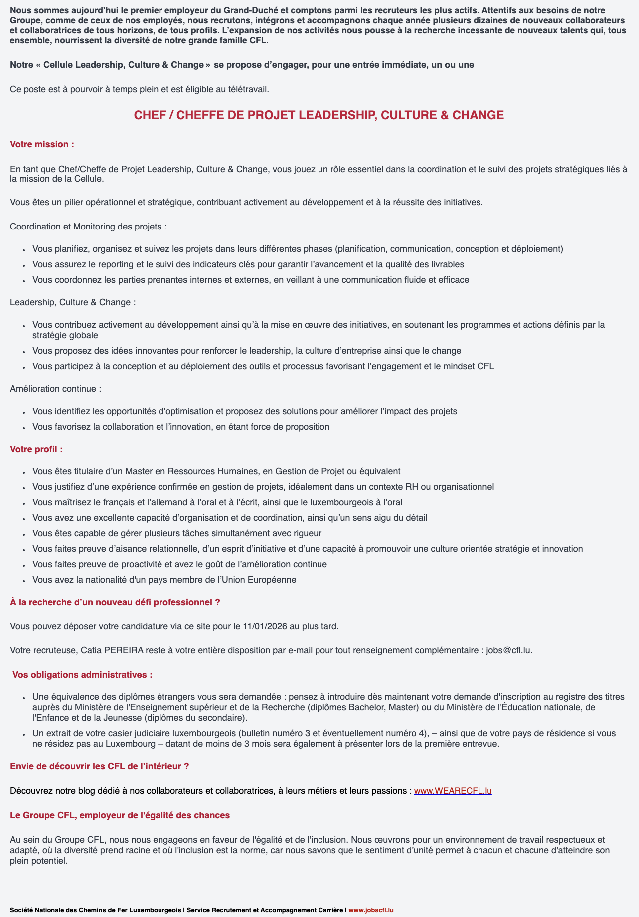 Chef (m/f) de projet Leadership, Culture & Change / CFL Voir toutes les offres CFL recrute ! Lien pour postuler : cliquez ici