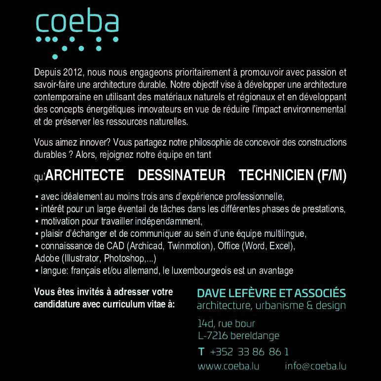 Coeba Architectes recrute ! Voir toutes les offres Architecte / Dessinateur / Technicien (h/f) Plus d’infos sur : www.coeba.lu