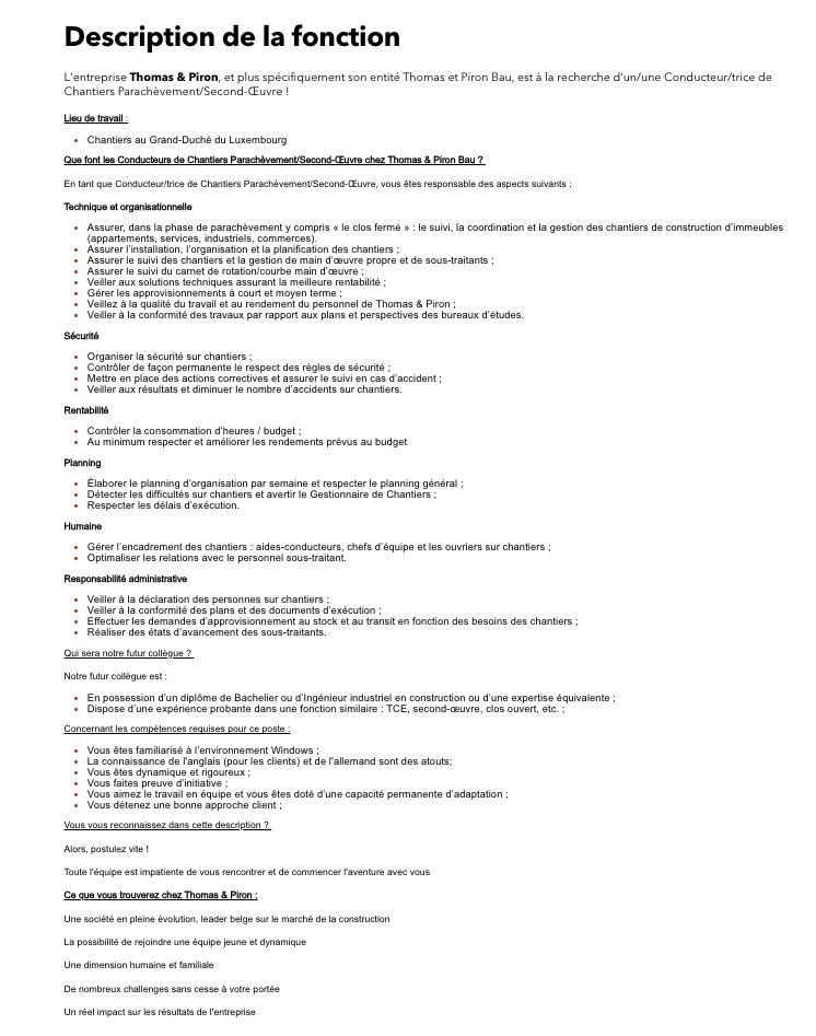 Conducteur de Chantiers Parachèvement/Second-Œuvre (H/F) Voir toutes les offres Thomas & Piron recrute ! Lien pour postuler : cliquez ici