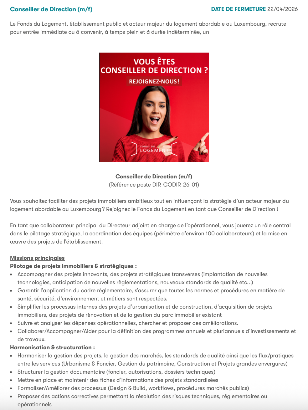 Conseiller de Direction (M/F) Voir toutes les offres Les Fonds du logement recrutent ! Lien pour postuler : cliquez ici