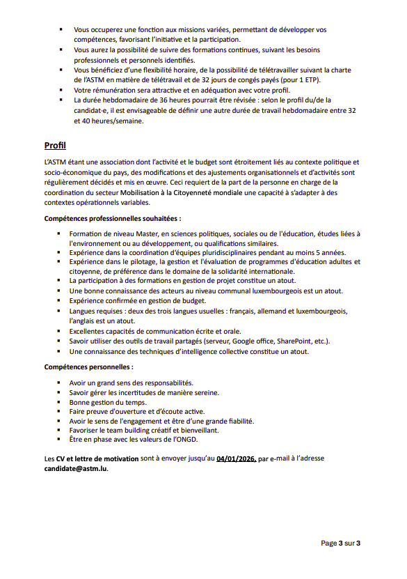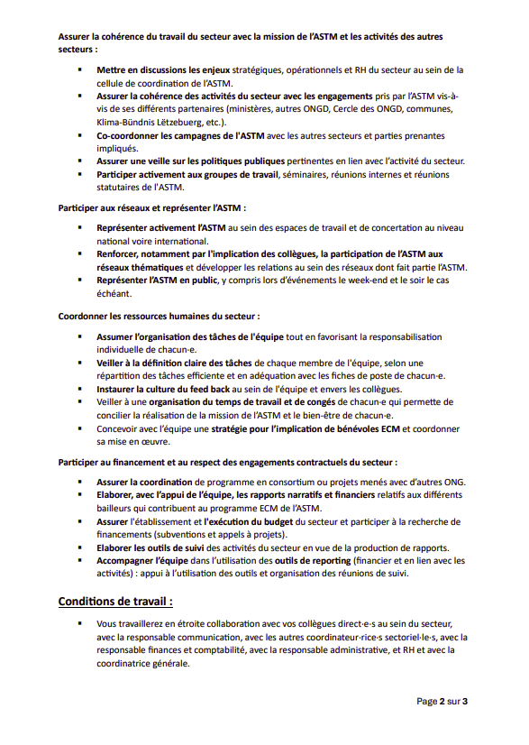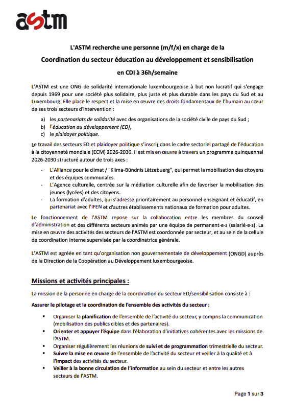 Coordinateur du secteur éducation au développement et sensibilisation (m/f/x) Voir toutes les offres L’ONGD ASTM recrute ! Lien pour postuler : cliquez ici