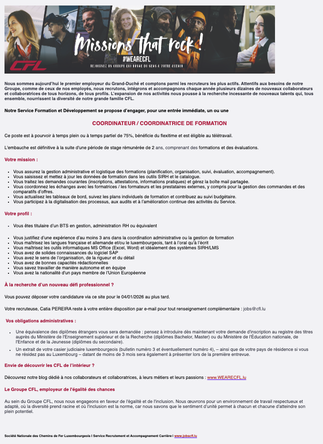 Coordinateur (m/f) de formation / CFL Voir toutes les offres CFL recrute ! Lien pour postuler : cliquez ici