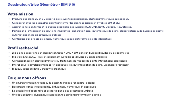 Dessinateur Géomètre - BIM & IA (m/f) / Seco Voir toutes les offres Seco recrute ! Lien pour postuler : cliquez ici