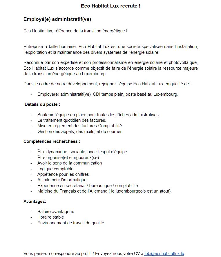 Vous pensez correspondre au profil ? Envoyez-nous votre CV à job@ecohabitatlux.lu