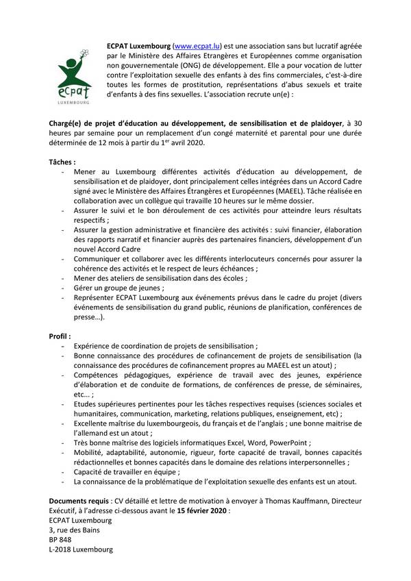 Toutes les informations à cette adresse : http://ecpat.lu/actualite/nous-recrutons