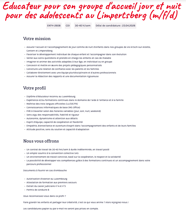 Éducateur groupe d’accueil jour et nuit pour adolescents au Limpertsberg (M/F) Voir toutes les offres Elisabeth Luxembourg recrute ! Lien pour postuler : cliquez ici