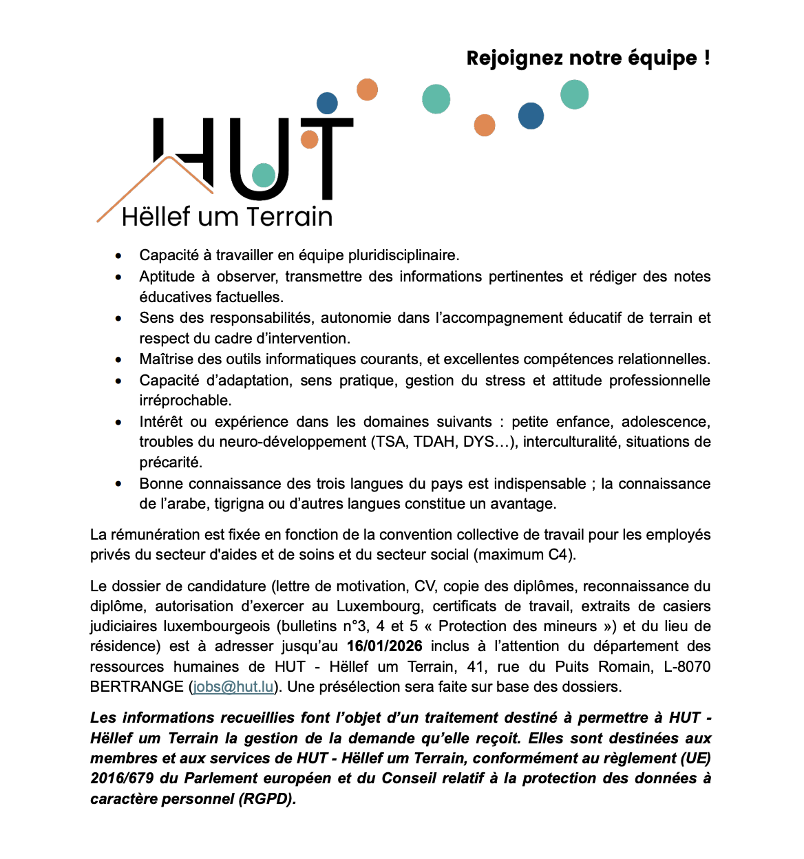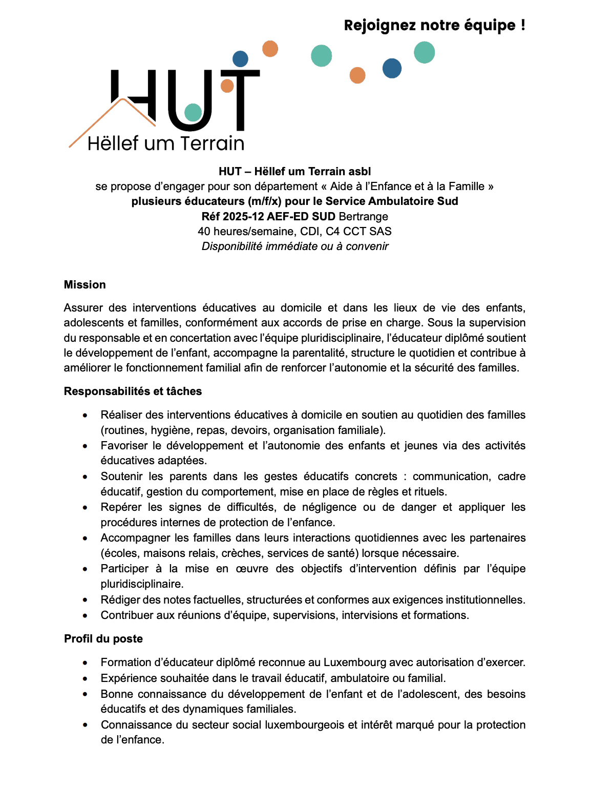 Éducateurs diplômés (m/f/x) / HUT Voir toutes les offres Hëllef um Terrain - HUT recrute ! Lien pour postuler : cliquez ici