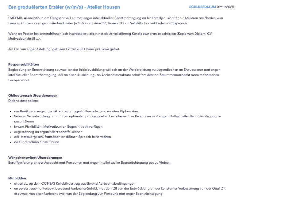 Een graduéierten Erzéier (m/f) / APEMH Voir toutes les offres APEMH recrute ! Lien pour postuler : cliquez ici