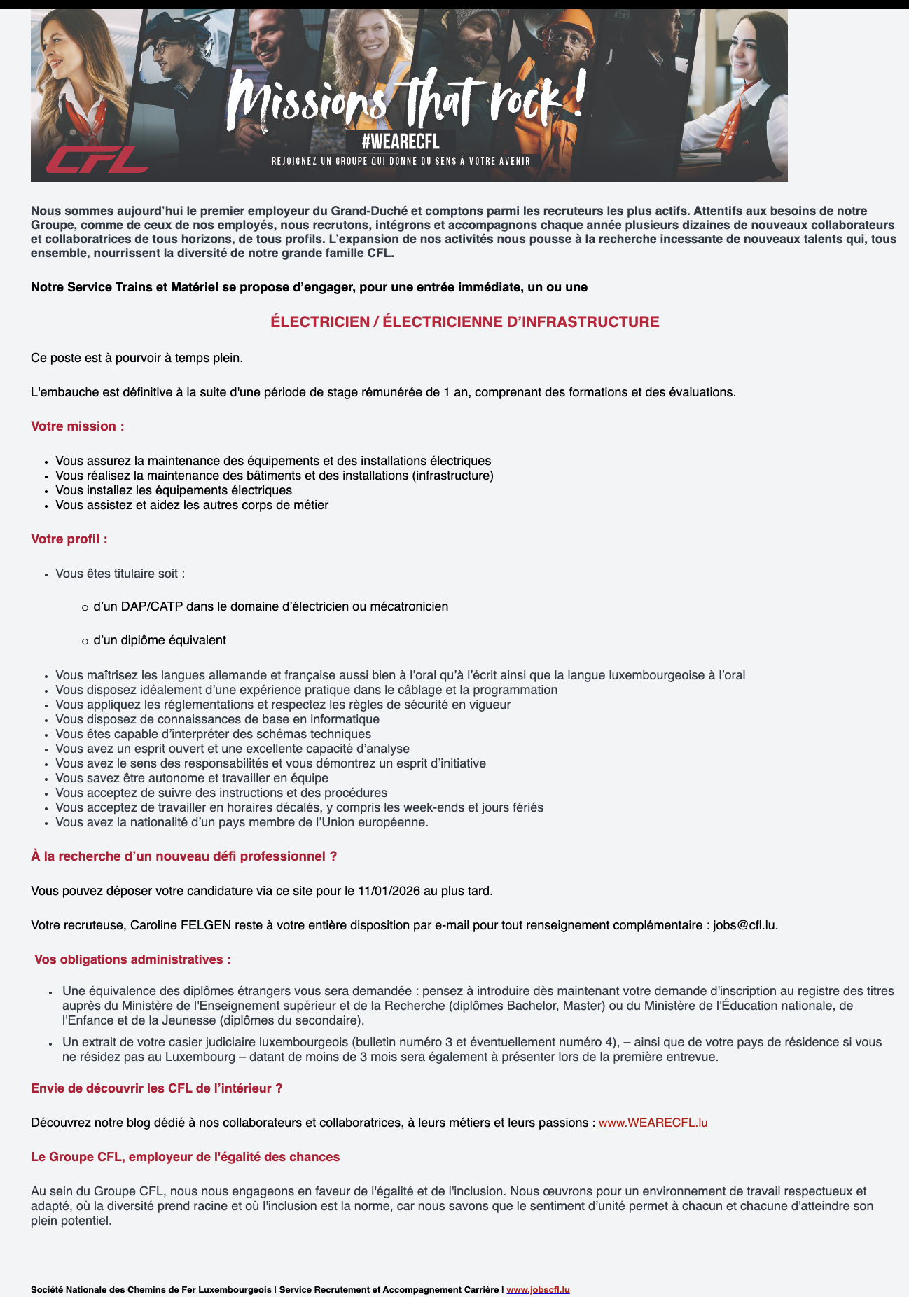Électricien (m/f) d’infrastructure / CFL Voir toutes les offres CFL recrute ! Lien pour postuler : cliquez ici